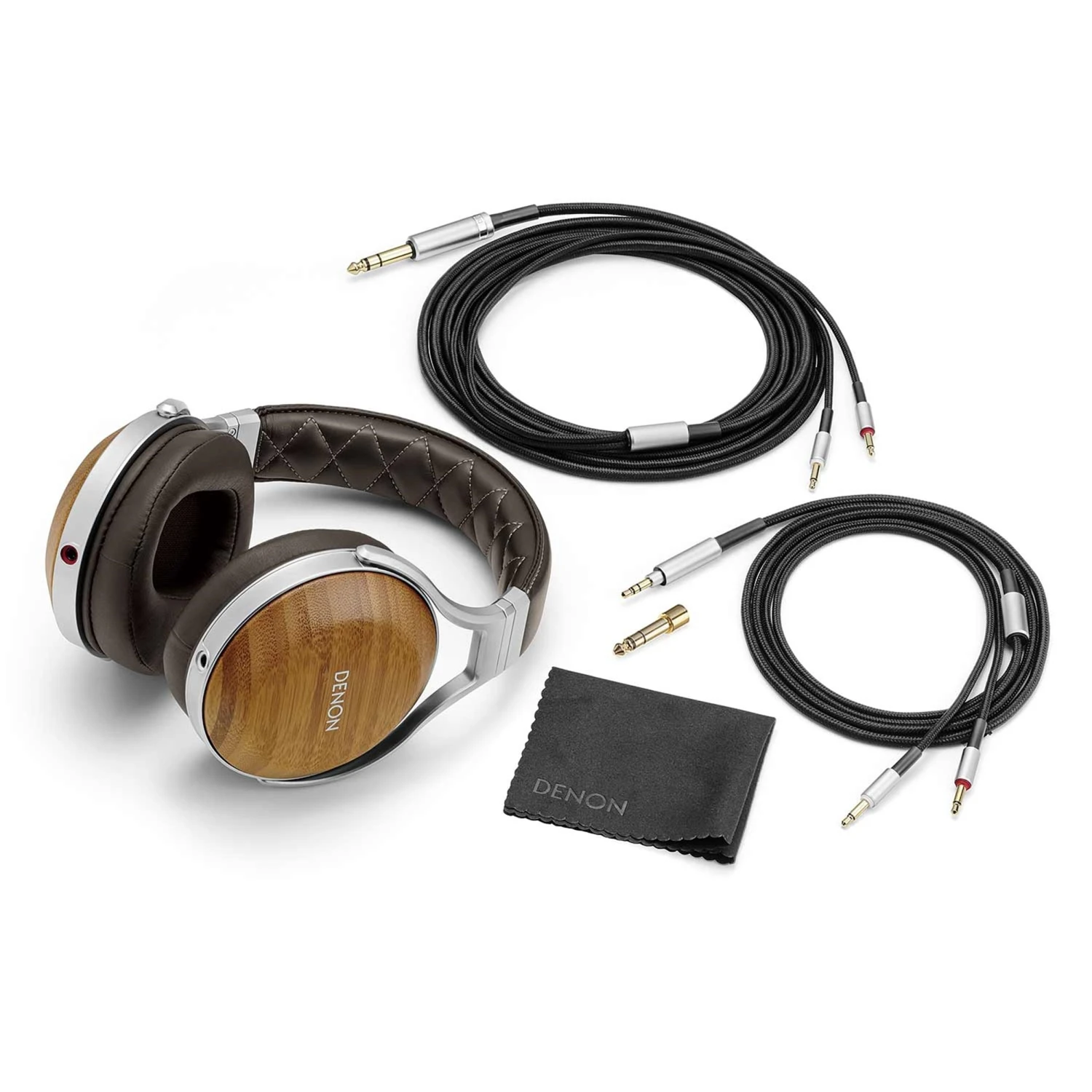Der Bügel ist mit echtem Leder bezogen, während für die atmungsaktiven Ohrpolster extrem weiches und angenehmes Kunstleder gewählt wurde – nicht aus Kostengründen, sondern weil es noch bessere Eigenschaften als das Naturprodukt besitzt. Die Polster sind mit einem Memory-Schaum gefüllt, der sich an die Kopfform anpasst und größtmöglichen Tragekomfort garantiert. Die Hörmuscheln hängen in Denons patentiertem Kugel-Drehgelenk, das sich an Größe und Form des Kopfes anpasst.