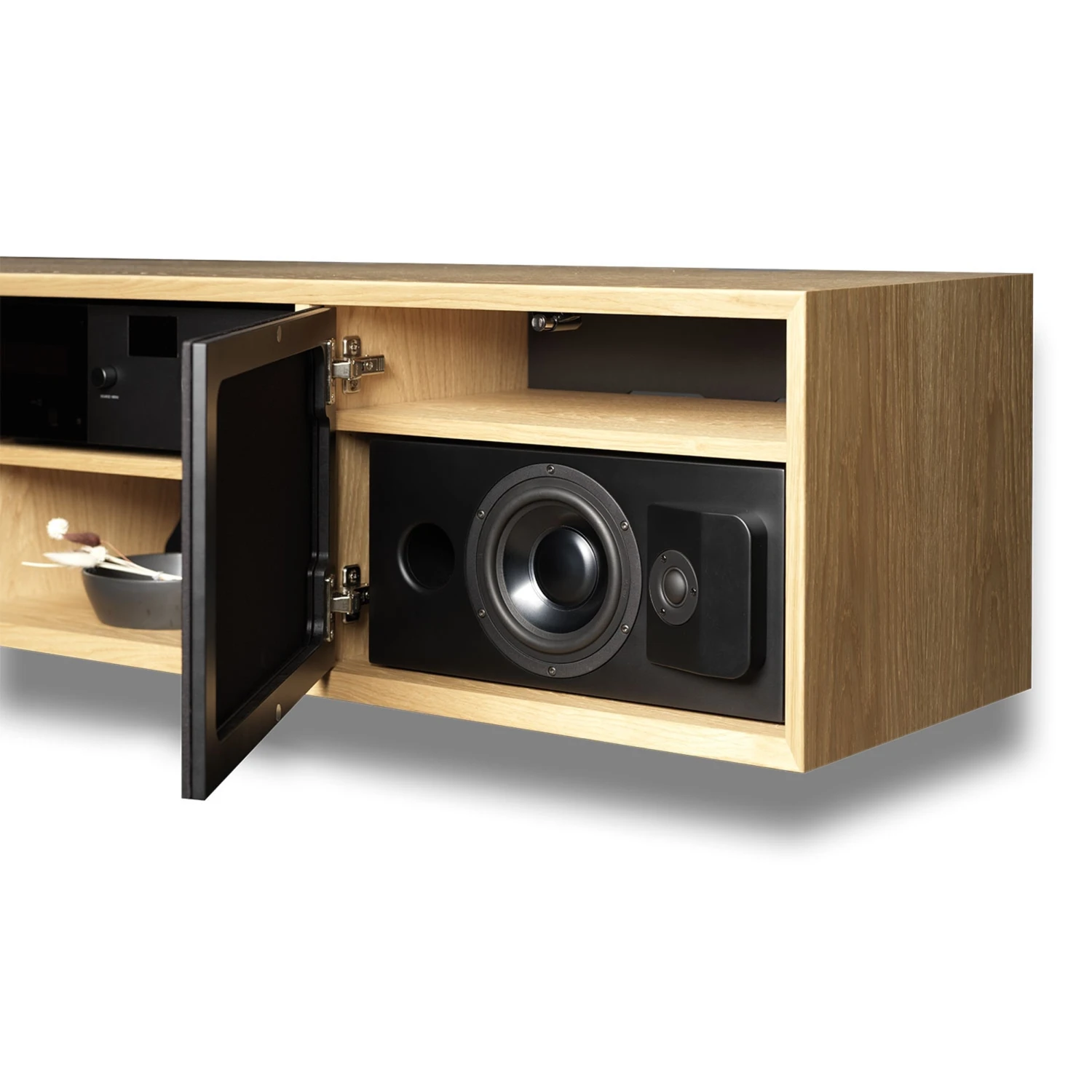 - Ideal für die horizontale Platzierung in TV-Möbeln (hinter Stofftüren)