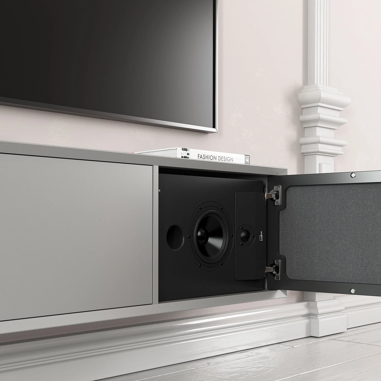 - Abgestimmt für die horizontale Platzierung in einem Möbel (hinter einer Stofftür)