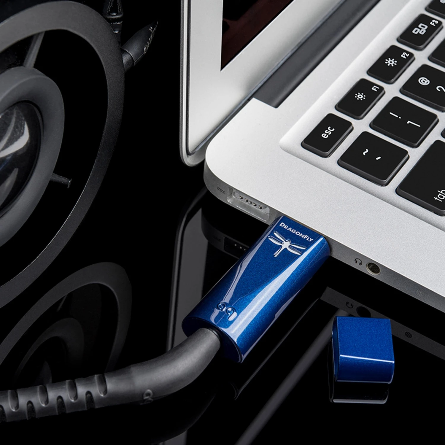 Der AudioQuest DragonFly Cobalt ist in Blau erhältlich. DragonTail USB-C auf USB-A-Adapter wird mitgeliefert.
